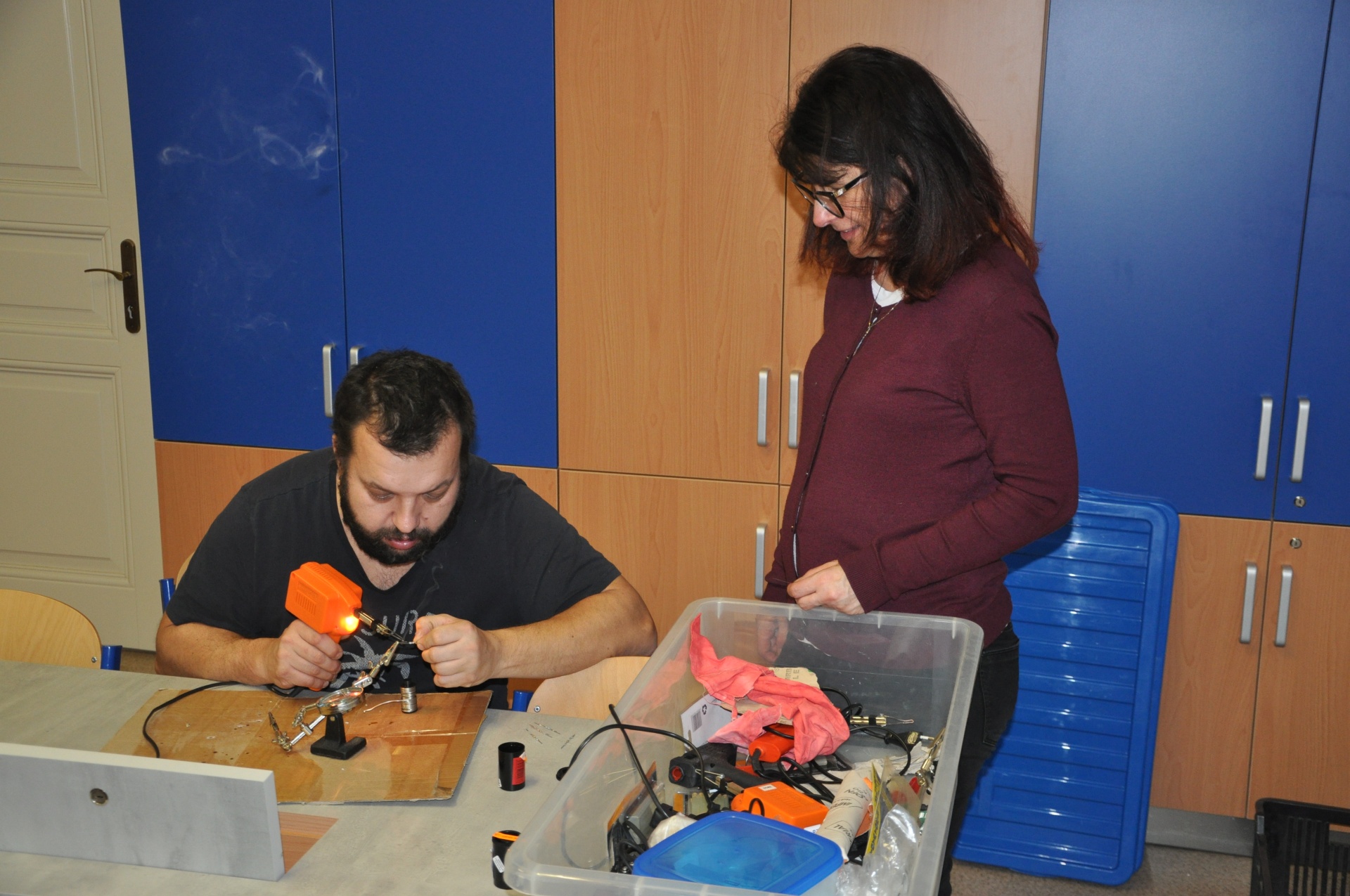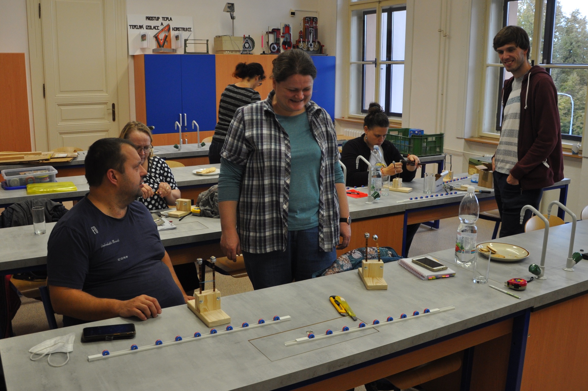 Dubnové setkání se neslo v rytmu hudby reprodukované z "hrajících destiček", které jsme s účastníky vyráběli včetně zapojení zesilovačů podle návodu L. Dvořáka. S vyrobenými destičkami jsme si také ukazovali účinky magnetické síly působící na vodič s proudem v magnetickém poli a zkoušeli jsme, na čem závisí velikost a směr této síly.
